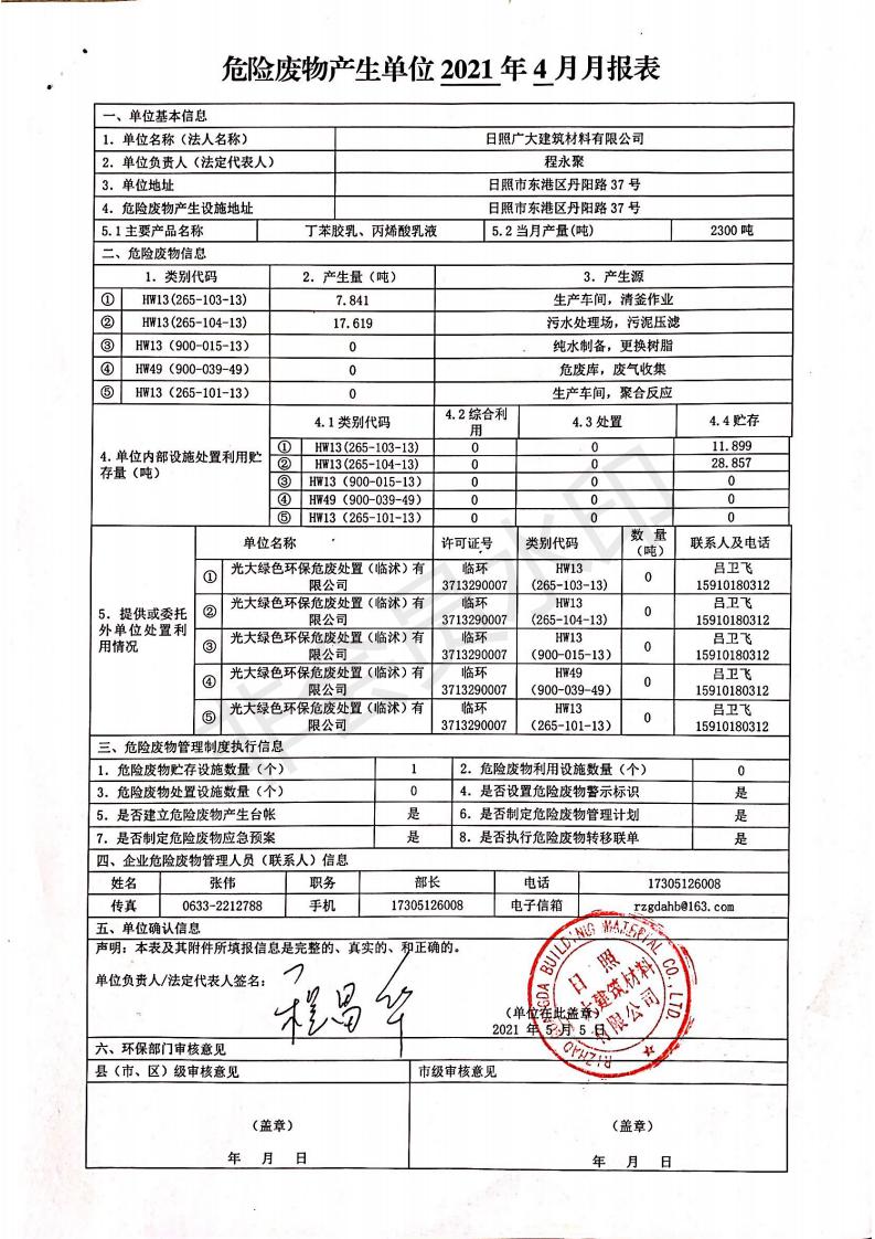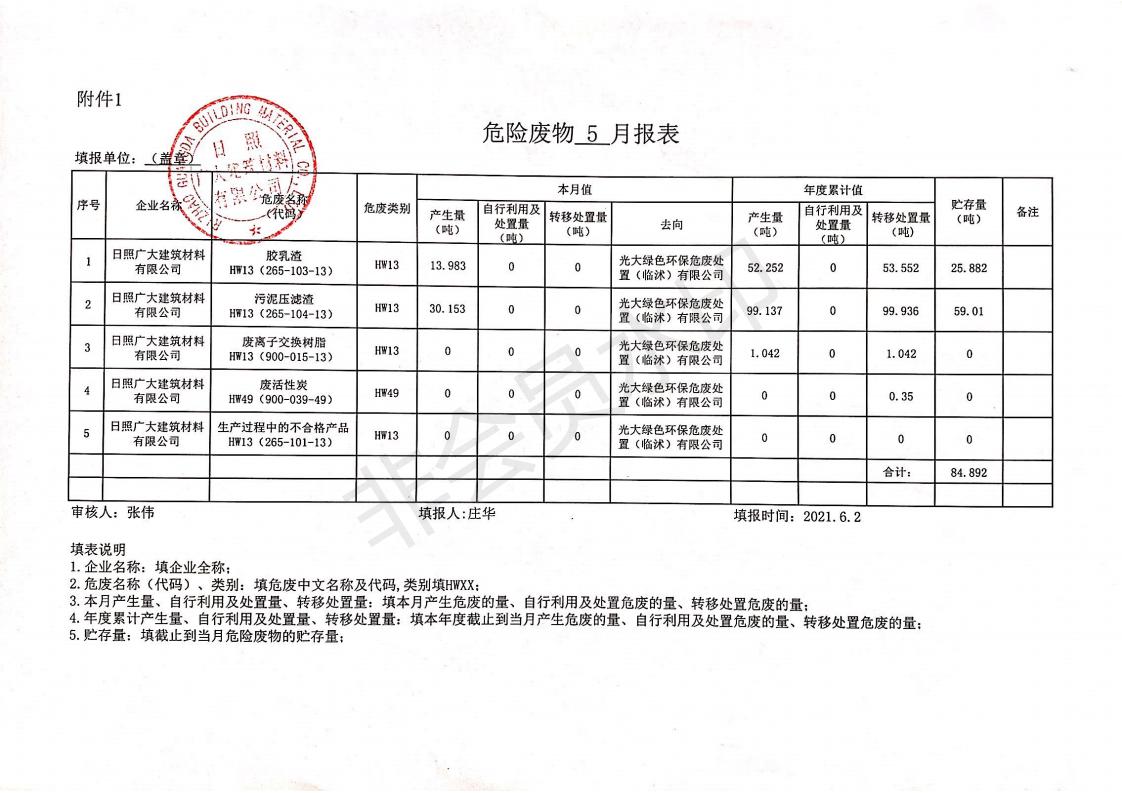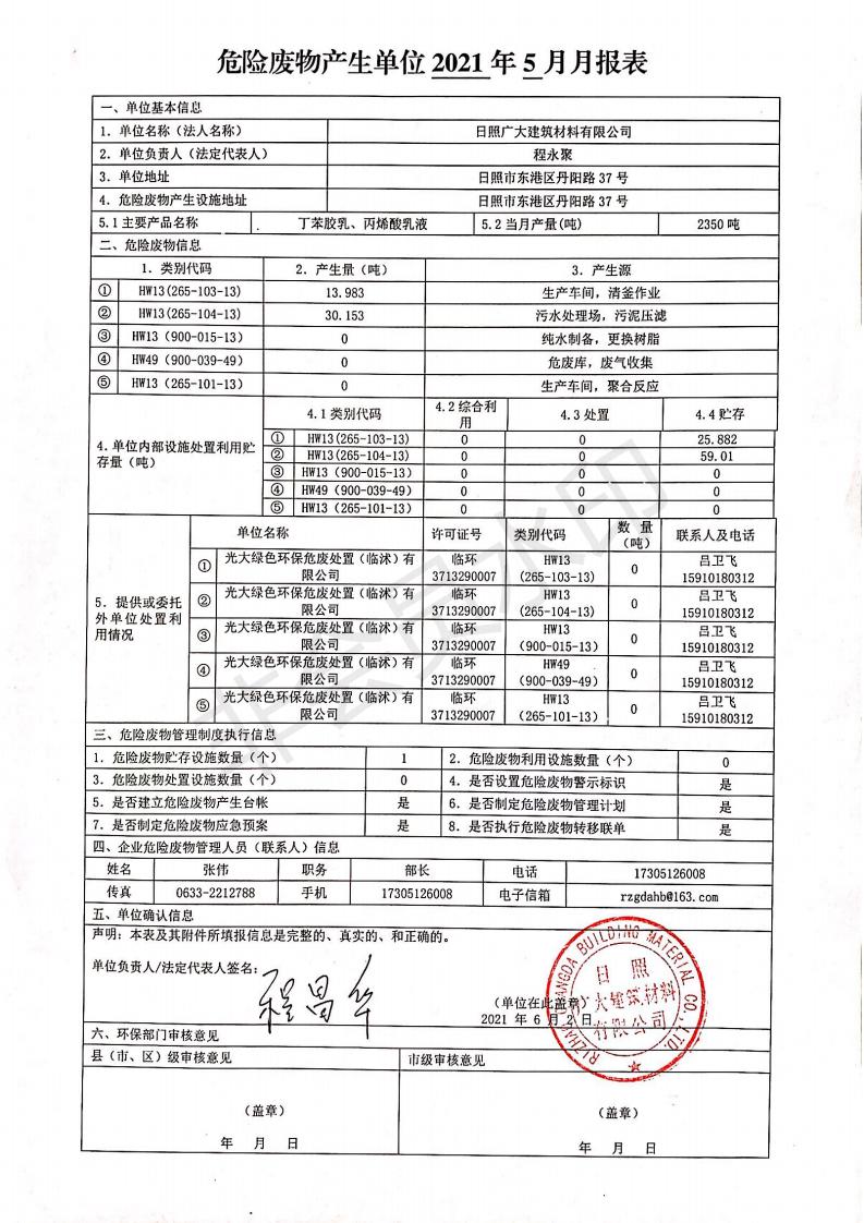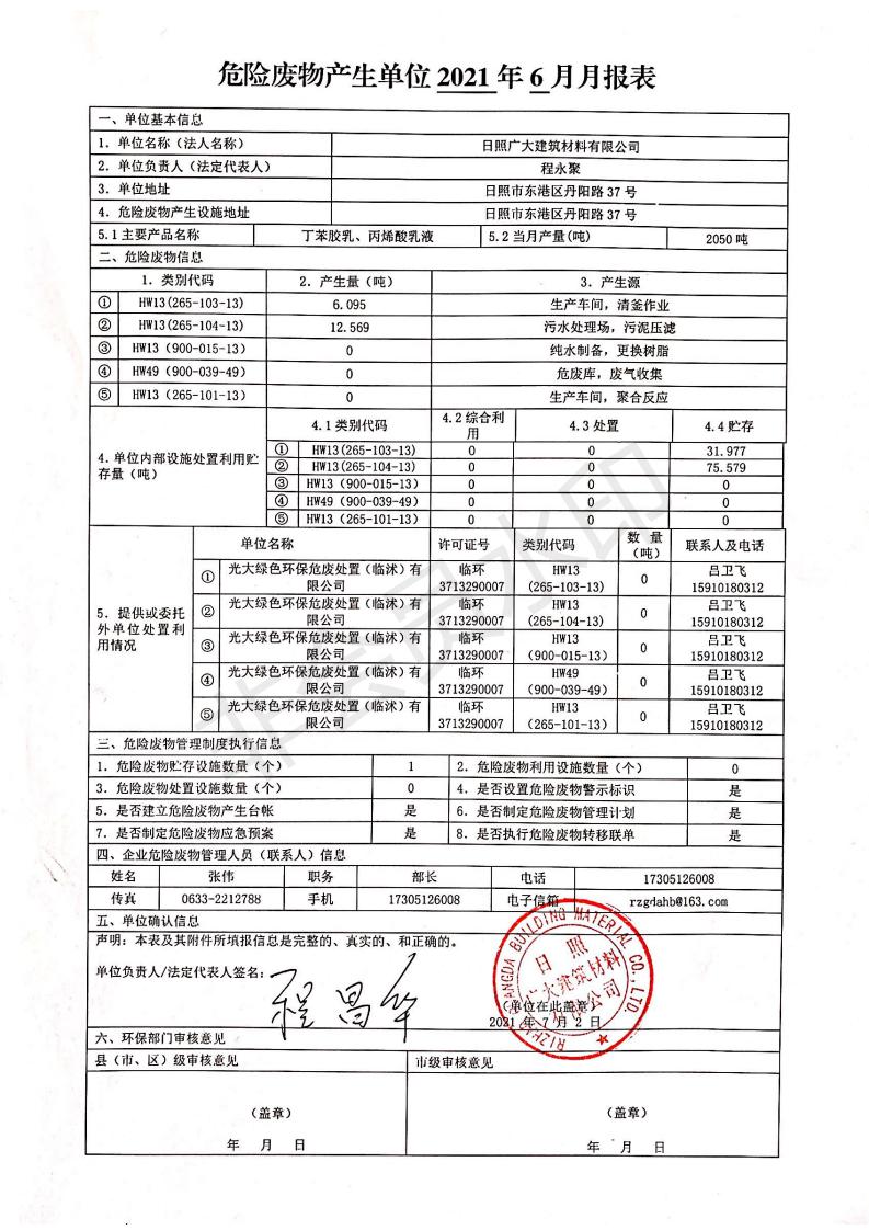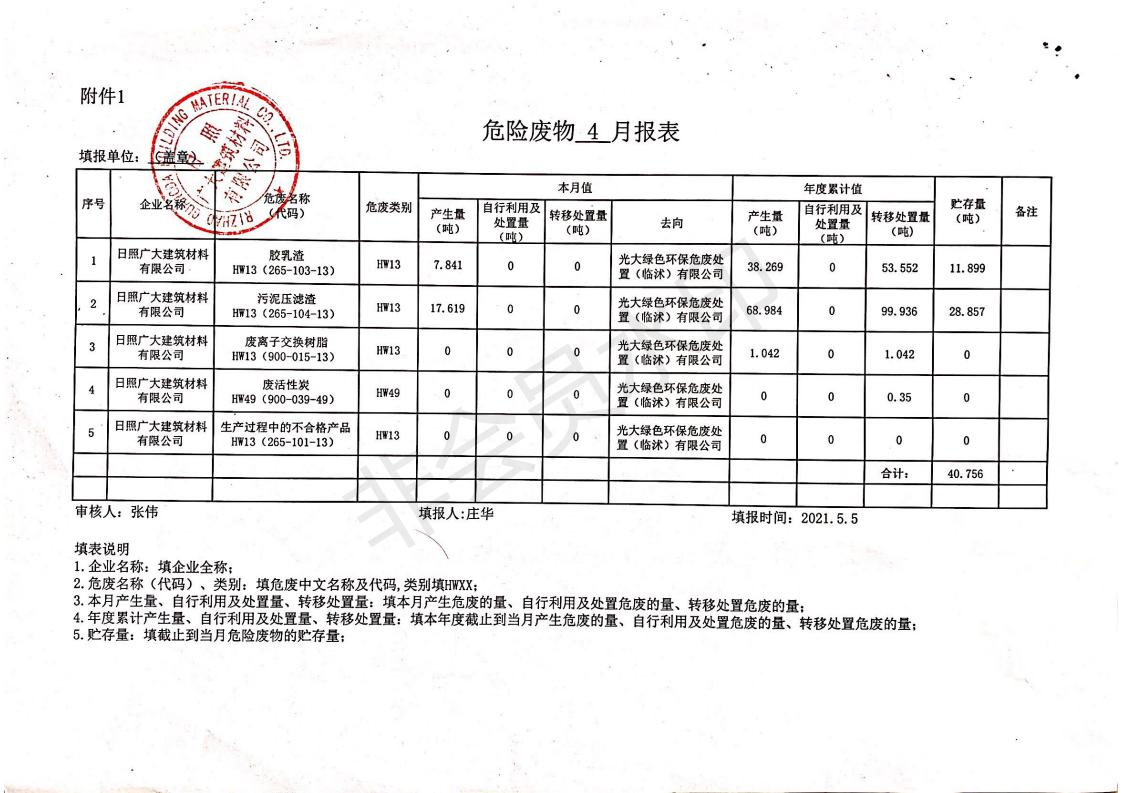 日照廣大建筑材料有限公司2021年04月~06月、第二季度產(chǎn)生報(bào)表